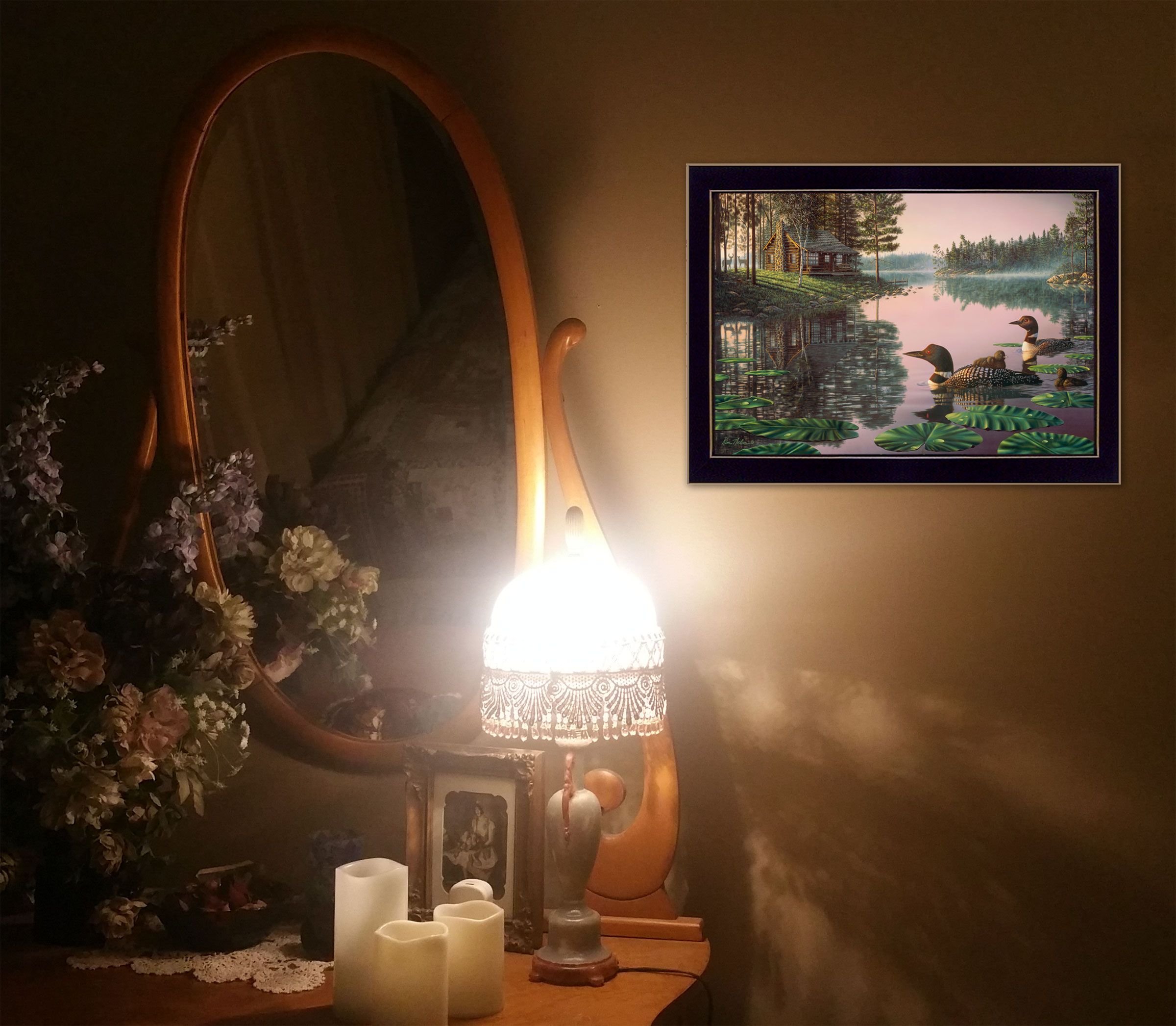 NFA191-712 Northern Tranquility, by artist Kim Norlien, in a decorative 20 x 14 brown frame. A beautiful scenic view of a waterway with loons, and cottage on the shore in the distance. The surface of the print is textured with a fade resistant coating so no glass is necessary. Arrives ready to hang. Made in the USA by skilled American workers.•TEXTURED ARTWORK with a 'rolled on' acid-free acrylic coating to create a canvas painting effect.•UV PROTECTANT COATING protects artwork from fading. No glass is necessary.• MOULDING adds natural beauty to the framed art. Frame is keyholed for the easy hanging.•THIS FINE HOME DECOR piece made in the USA by Woman Owned Business (WBE) is a perfect gift for a friend or relative.