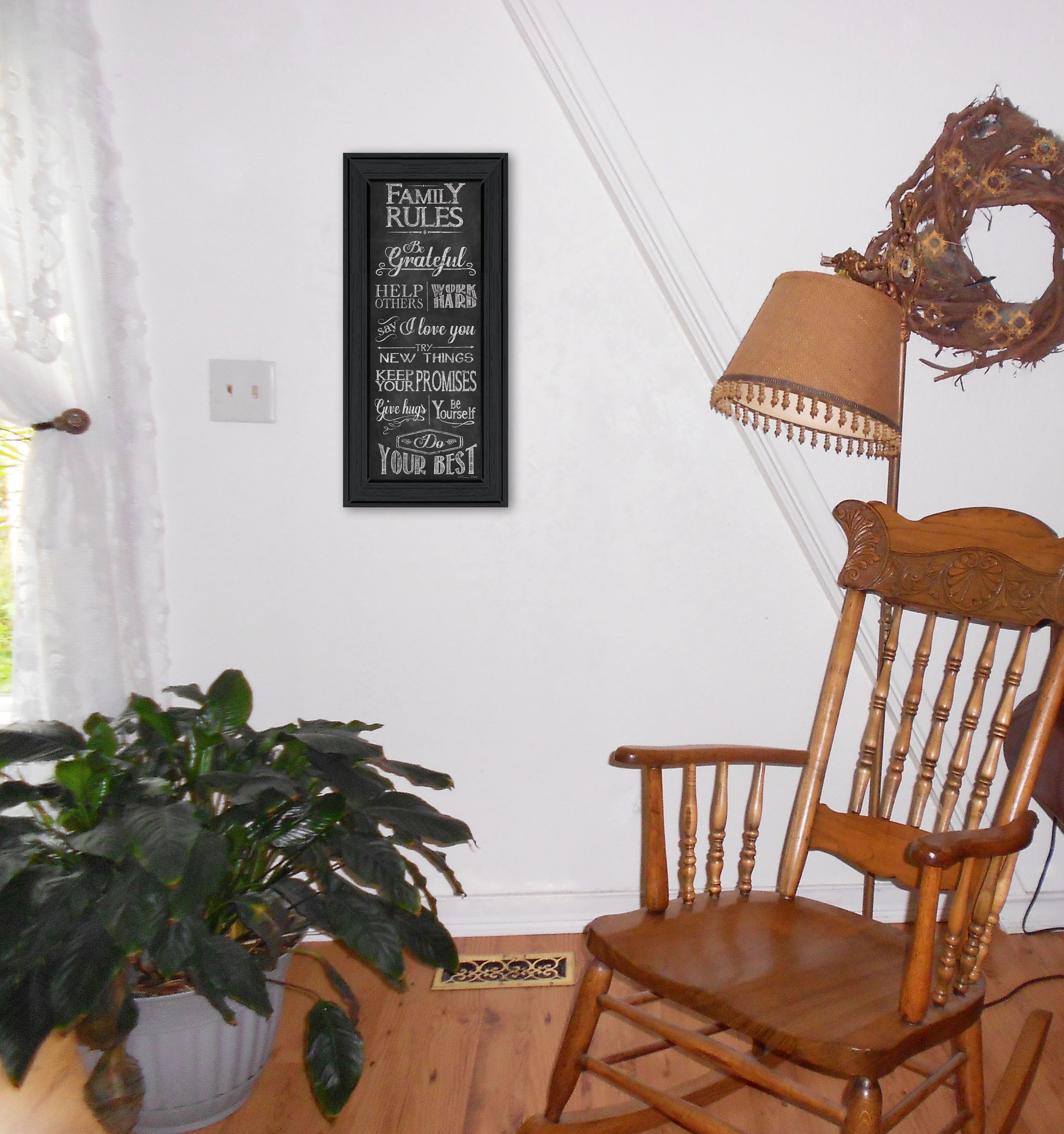Family Rules is a 15" x 39" framed print by artist Susan Ball. This artwork features a chalkboard look and list things you would like family members to do-help others, work hard, give hugs, etc. This print is textured and ready to hang.•Women Owned (WBE)•Textured Artwork with a 'rolled on' acid free acrylic coating to create a canvas painting effect. No glass is necessary.•UV protectant coating protects artwork from fading.•MDF moulding adds natural beauty to the framed art. Frame is keyholed for ease of hanging.