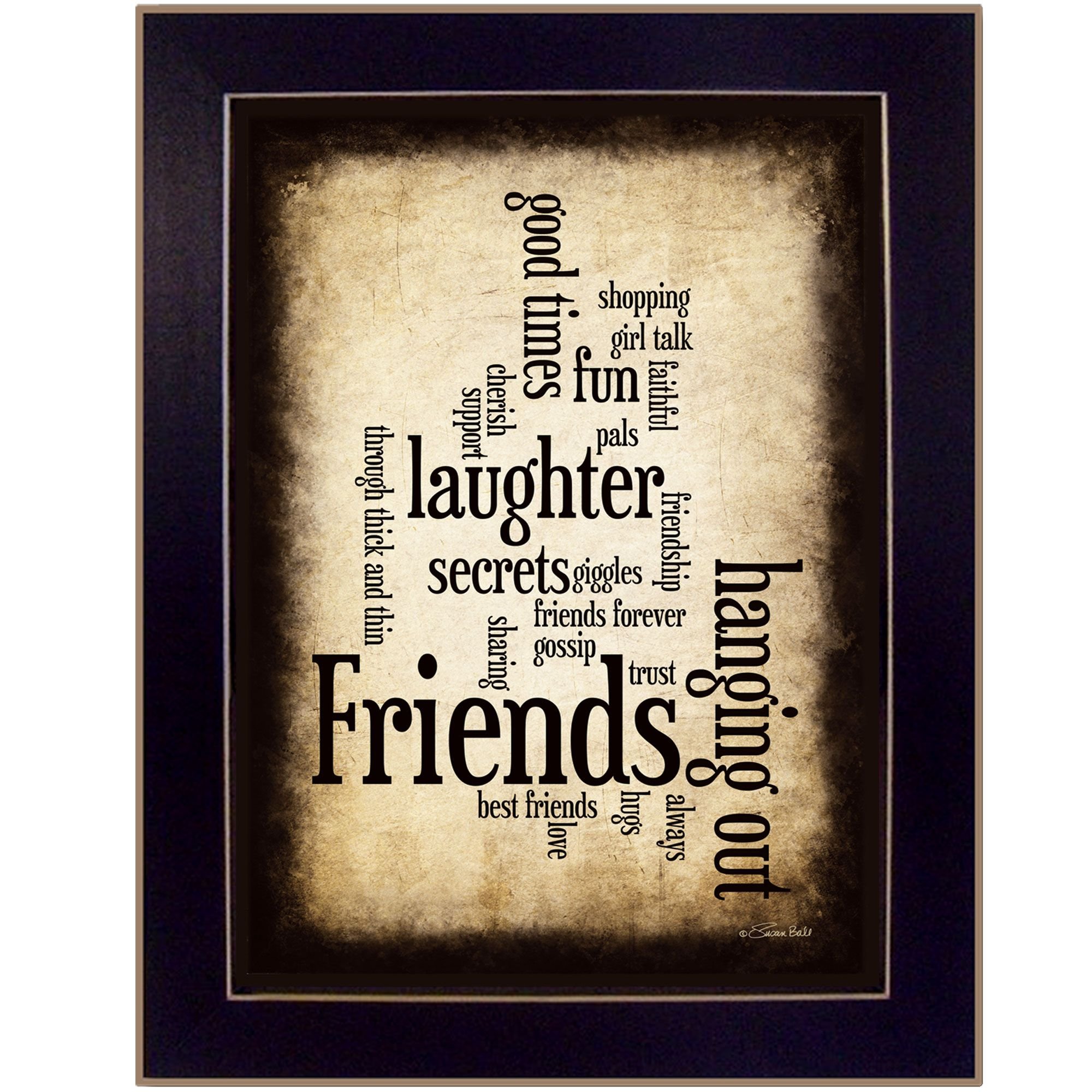 "Friends" is a 14"x 20" black framed script framed art print. This artwork features words relating to friendship-laughter, secrets and giggles by artist Susan Ball. This totally American Made wall decor item features an decorative black frame. The framed art print has a protective, archival finish (glass is not needed) and arrives ready to hang.•Women Owned (WBE)•Textured Artwork with a 'rolled on' acid free acrylic coating to create a canvas painting effect. No glass is necessary.•UV protectant coating protects artwork from fading.•Arrives Ready to Hang