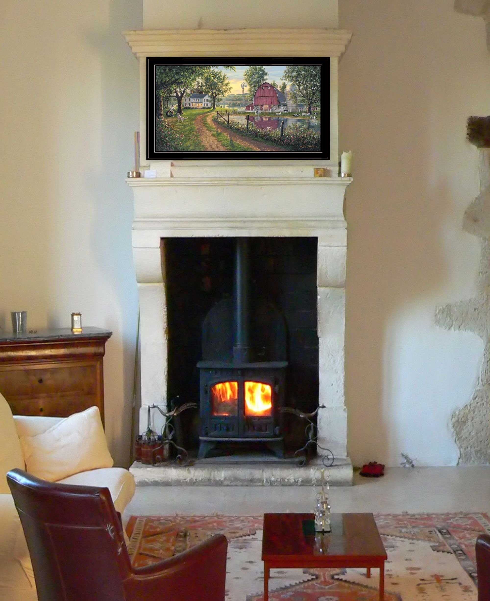 "The Road Home" by artisan Kim Norlien. This is a 38"x21" black framed print of an active farm in the country. In front of a farmhouse a child plays with his dog while Holstein cows lounge in front of a big red barn. A colorful, tranquil depiction of small farm life. Crafted by skilled American crafters and coated with a fade-resistant texture, this piece has a canvas-like appearance that will last for years to come. Invest in a piece that is truly one-of-a-kind.•Transform your walls with this stunning piece of art and bring a touch of modern elegance to your room. This stunning piece will not only add visual interest to any room but it's minimalist design will bring a sense of serenity to your space.•Tired of dull, empty walls in your home? We believe that walls should inspire, not bore. That's why we offer a wide range of wall art to suit any space from bedroom and kitchens to office and beyond. Give your walls a facelift with our printed arts and transform your space into a stylish and inviting home.•This framed wall art is hand-crafted in the USA of high-quality wood with the surface of the art coated with a fade-resistant texture which gives it a canvas-like appearance for many years of enjoyment in your home.•Bring a pop of colour and style to any room with our fully assembled and ready-to-hang wall art. With a wide selection of decorative pieces to choose from, you'll easily find the perfect match for your personal taste or to give as a thoughtful gift. Don't miss out on the opportunity to add some unique charm to your space.•Experience the unmatched quality and durability of American-made craftsmanship with this individually hand-crafted wall decoration art. Skilled crafters put their expertise into every piece to ensure it will stand test of time and bless your eyes for years to come.