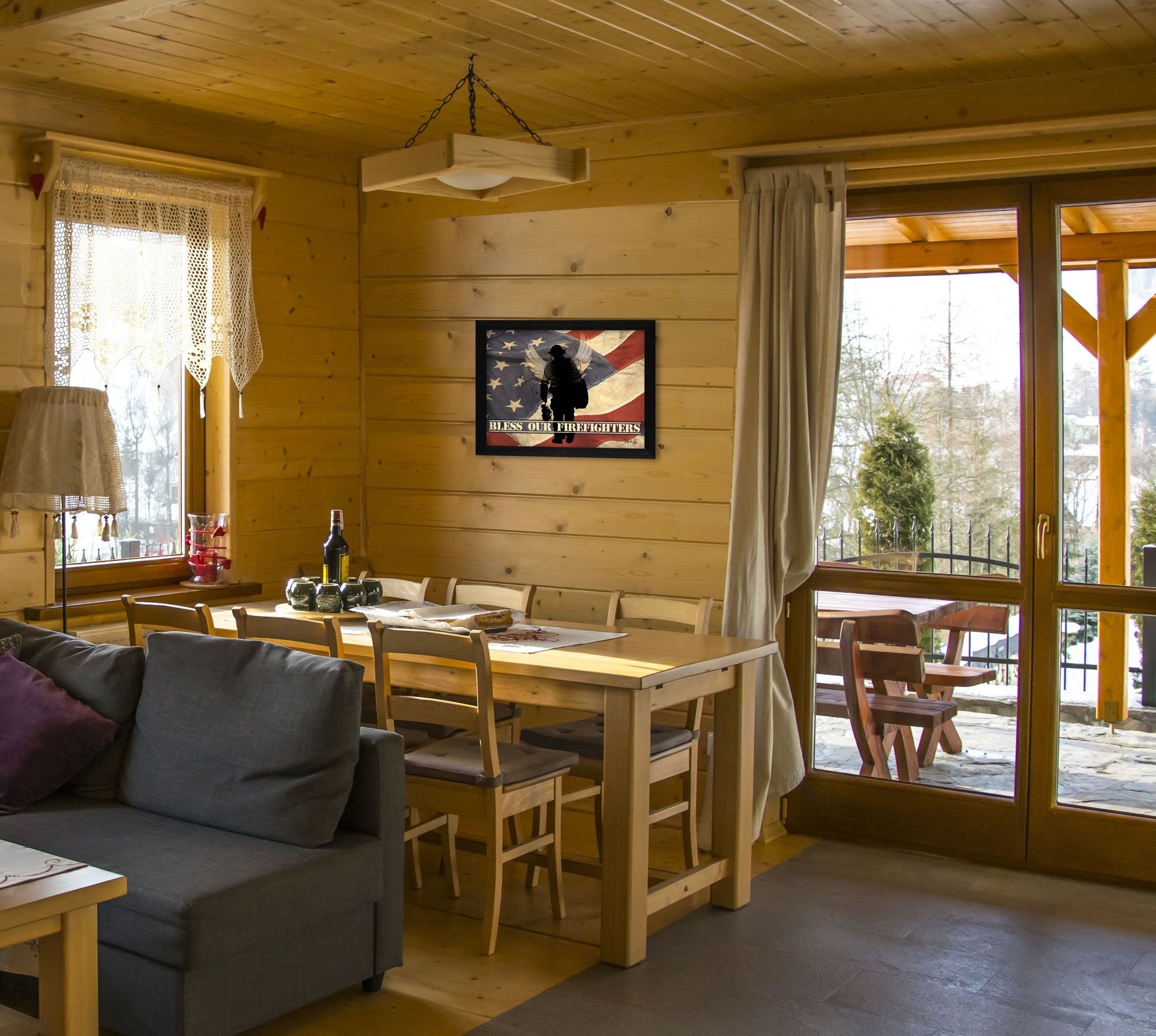Bless our Firefighters is a 18" x 14" framed print by artist Marla Rae. This artwork features the silhouette of a firefighter against the American Flag and reads bless our firefighters. This print is textured and ready to hang.•Women Owned (WBE)•Textured Artwork with a 'rolled on' acid free acrylic coating to create a canvas painting effect. No glass is necessary.•UV protectant coating protects artwork from fading.•MDF moulding adds natural beauty to the framed art. Frame is keyholed for ease of hanging.