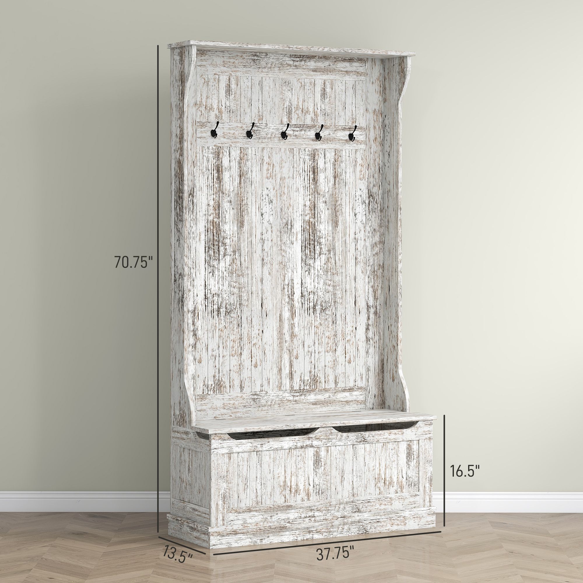 5.- Hall Tree with Storage Bench Info: Overall Dimensions: 37.75" W x 13.5" D x 70.75" H. Bench Size: 37.75" W x 12.5" D x 16.5" H.