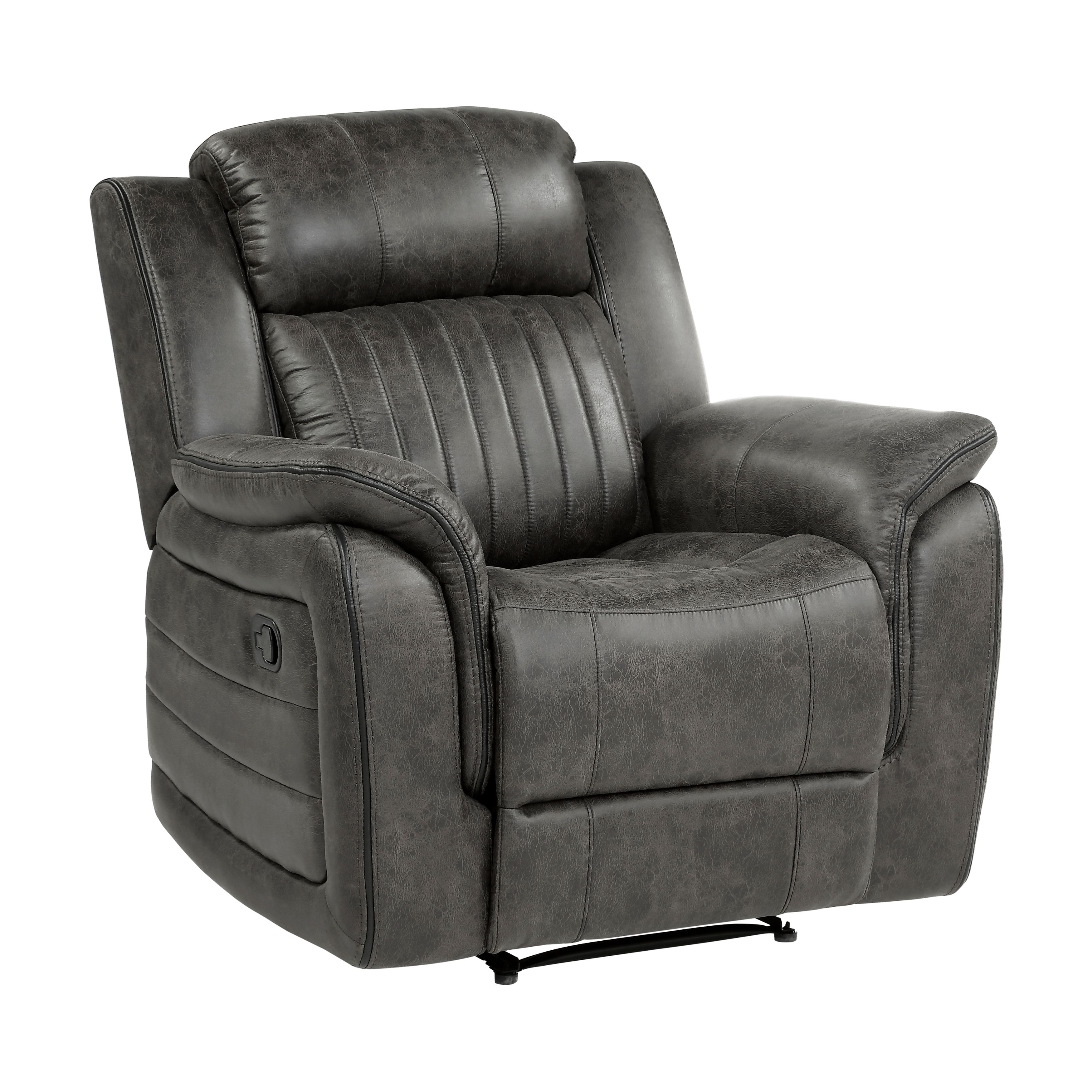The design of the Centeroak Collection provides a platform for your relaxing downtime. From the classic transitional style to the versatile neutral color of the brown-ish gray polished microfiber fabric covering, this chair is the perfect addition to your living room. Plush seating features vertical tufting, pillow-top arms, enhanced by the reclining mechanism which is engaged with a pull of the side mounted tab, taking you from seated to prone in an easy motion.PRODUCT DIMENSIONS:Overall Dimension: 39.5" x 38" x 41"HSeat Width: 19.5"Seat Depth: 21"Seat Height: 20.5"Arm height: 26"Fully reclined length: 65.5"Fully reclined height: 32"Doorway width: 26"Listing Includes: One Reclining Chair Only.Sofa and Loveseat: Not included.Simple Assembly Require.