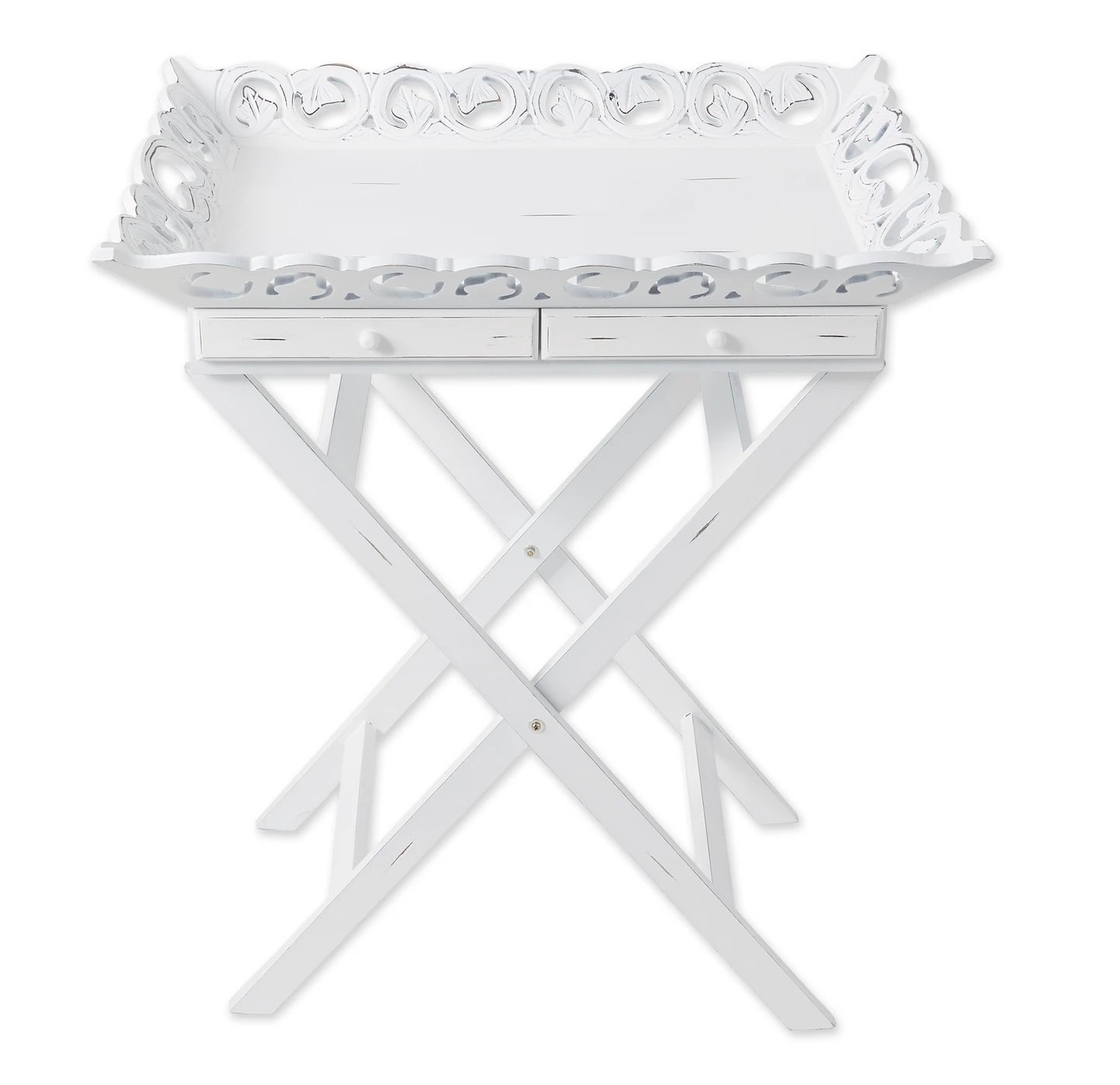• Gracious entertaining is a snap with this stylish tray table! Elegantly aged white finish with a carved rim and two handy drawers; folding legs for easy storage.