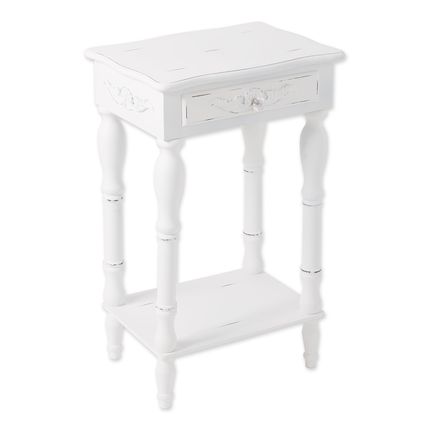 • Shaped legs and shell-design trim add distinction to this decorative side table perfect for any space in your home. A generous drawer and a bottom shelf also provide plentiful storage.