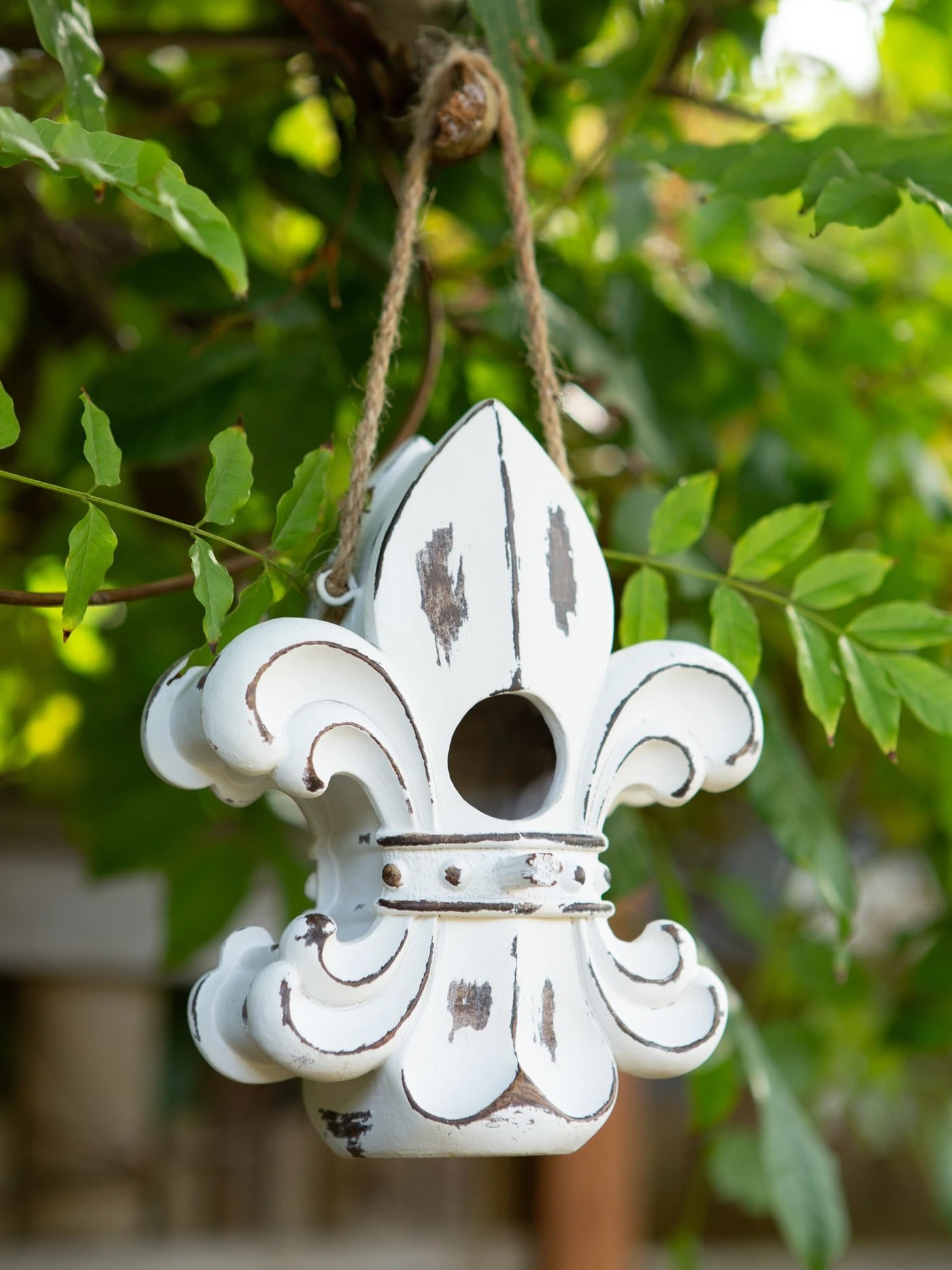 • Here's a stylish European-styled home for the birds! This unique birdhouse looks like a regal fleur-de-lis ornament with a weathered white finish and a linen rope for hanging.