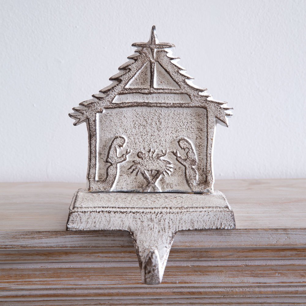 Give your mantel a rustic, religious touch this holiday season with our Nativity Stocking Holder. Item is whitewashed and made of cast iron. Holds a normal sized stocking.